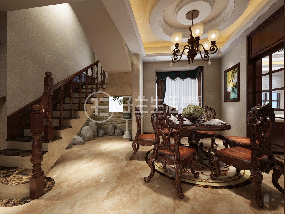客廳空間的層高較高,良好的采光讓整體客廳配以深色家具后整個(gè)客廳光線更加柔和,淡黃色墻面和地面的相互對(duì)比及相互呼應(yīng),讓整個(gè)空間明亮,家具的深色配色,更顯主人的大氣、沉穩(wěn)。
