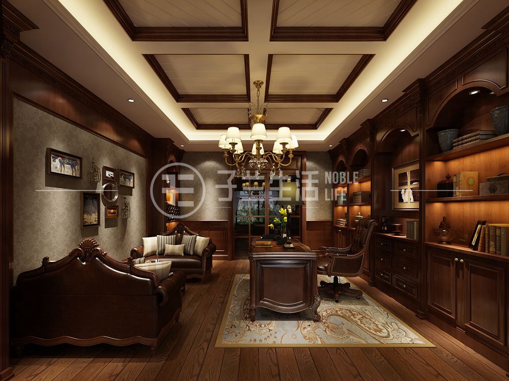 書房同樣保持著深色的配色,頂面的造型配以深色木制線和家具相互搭配,深色地板給人以柔和質(zhì)感。