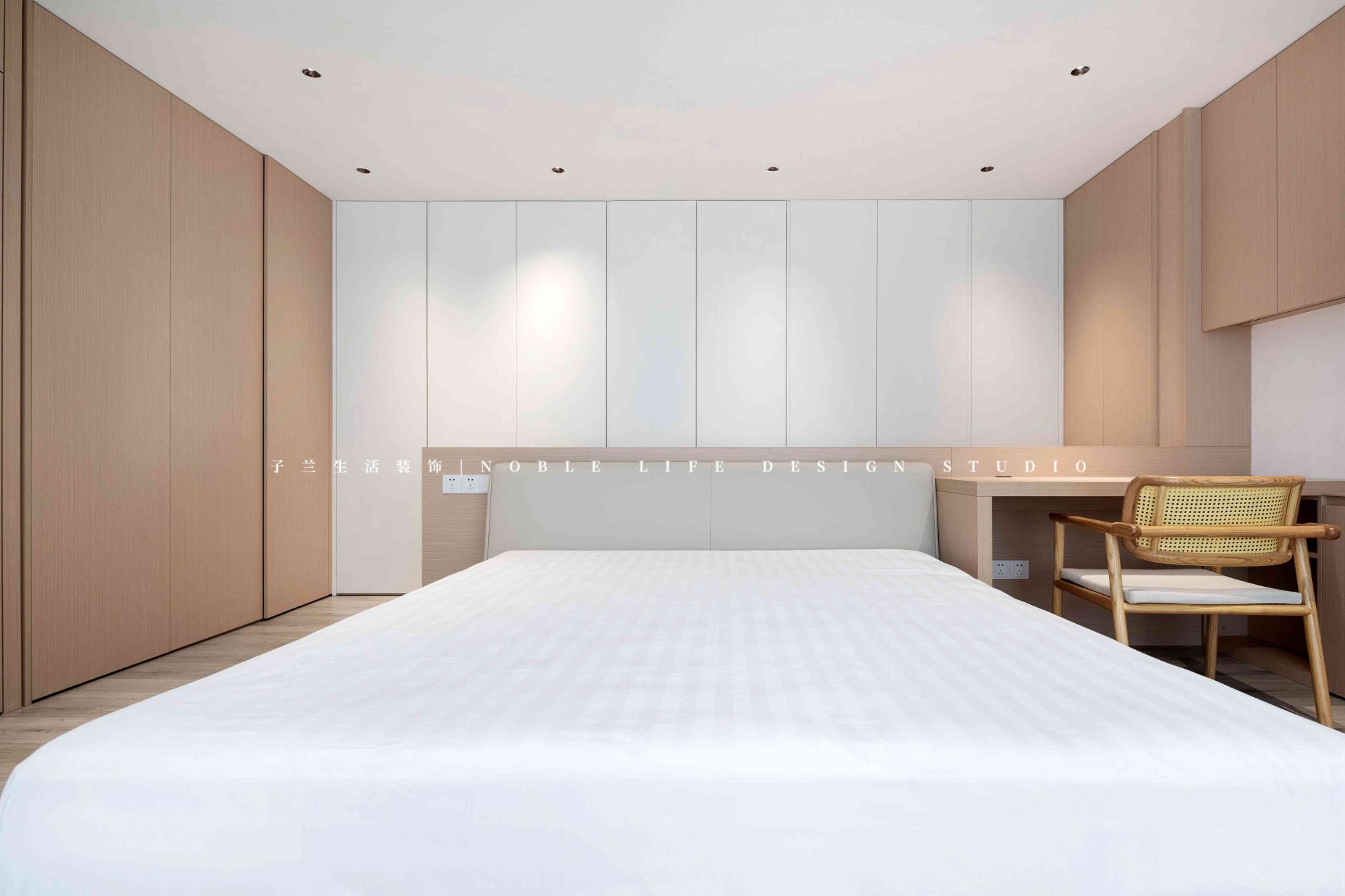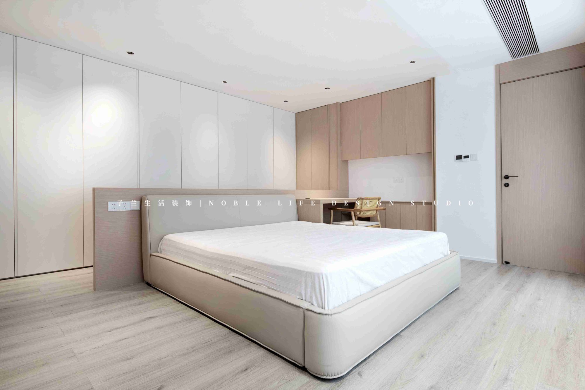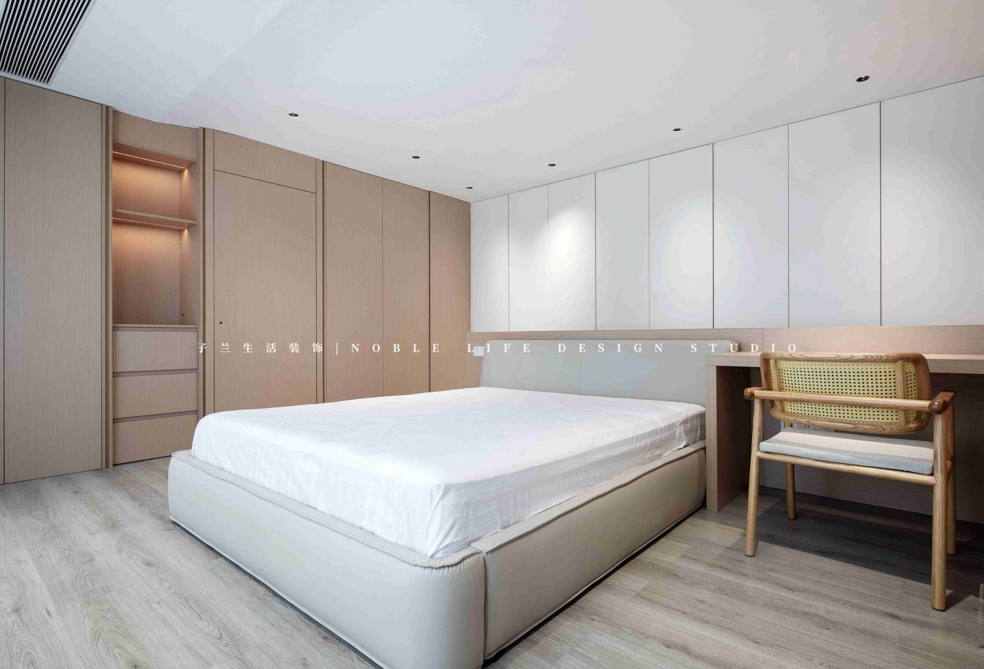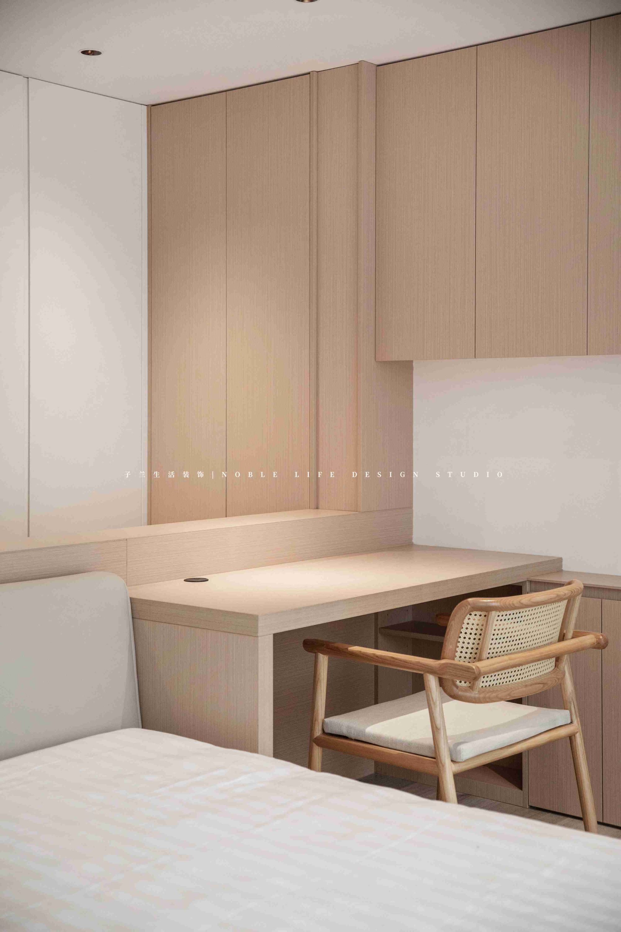 主臥套房一直是臥室+衣帽間+衛(wèi)生間,或者是臥室+單面衣柜+衛(wèi)生間,但館長先生和小藝小姐的主臥,和常規(guī)的完全不一樣。為了將空間功能最大化,設(shè)計師并未做單獨的衣帽間,而是床頭不靠墻,做三面收納柜,收納空間比做單獨衣帽間大。