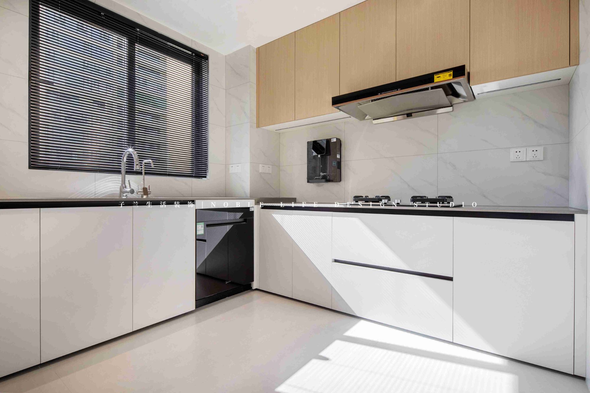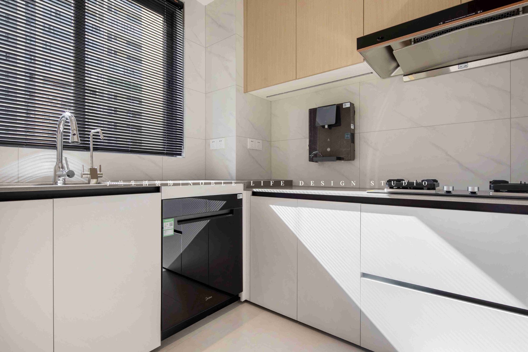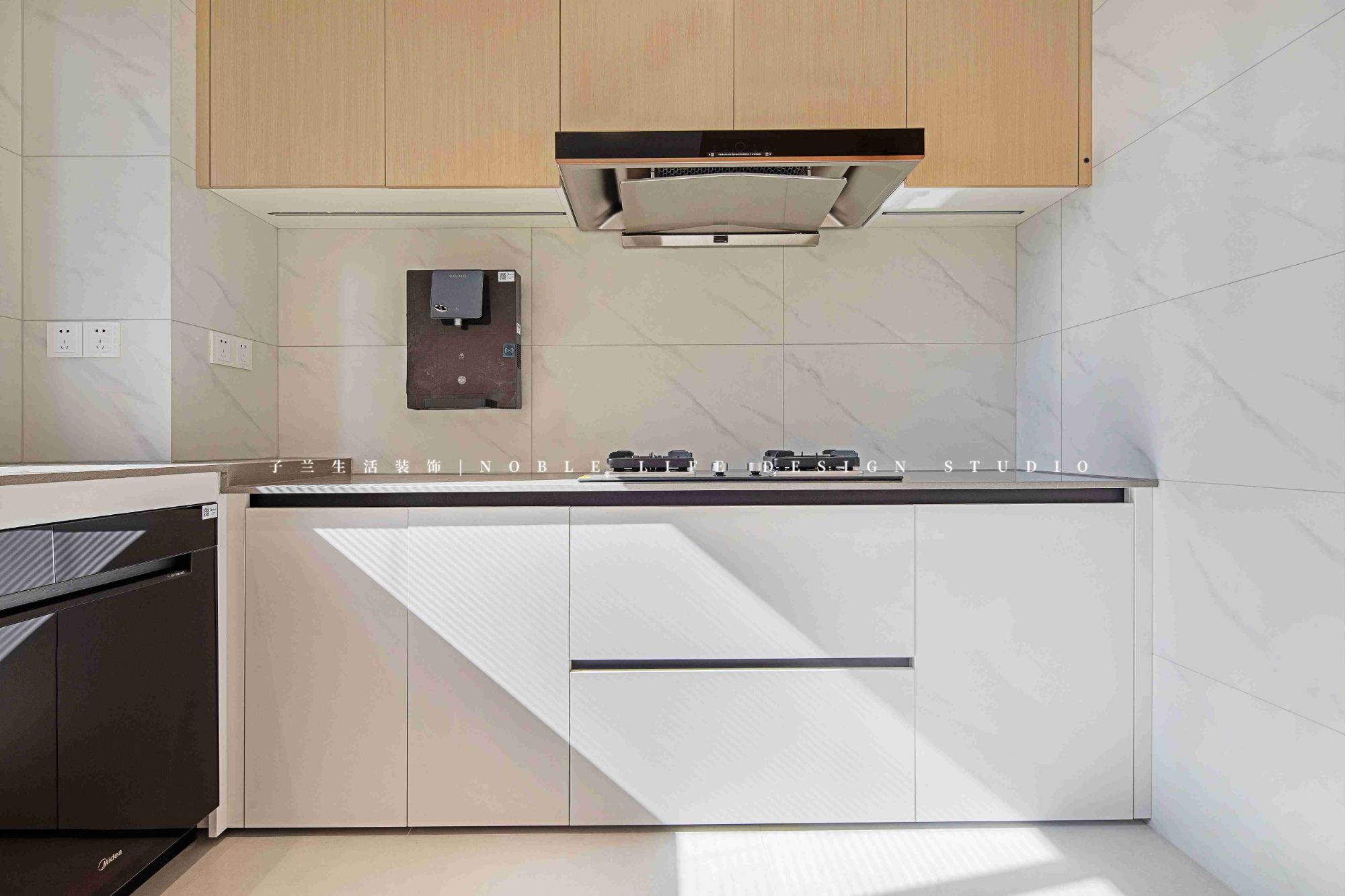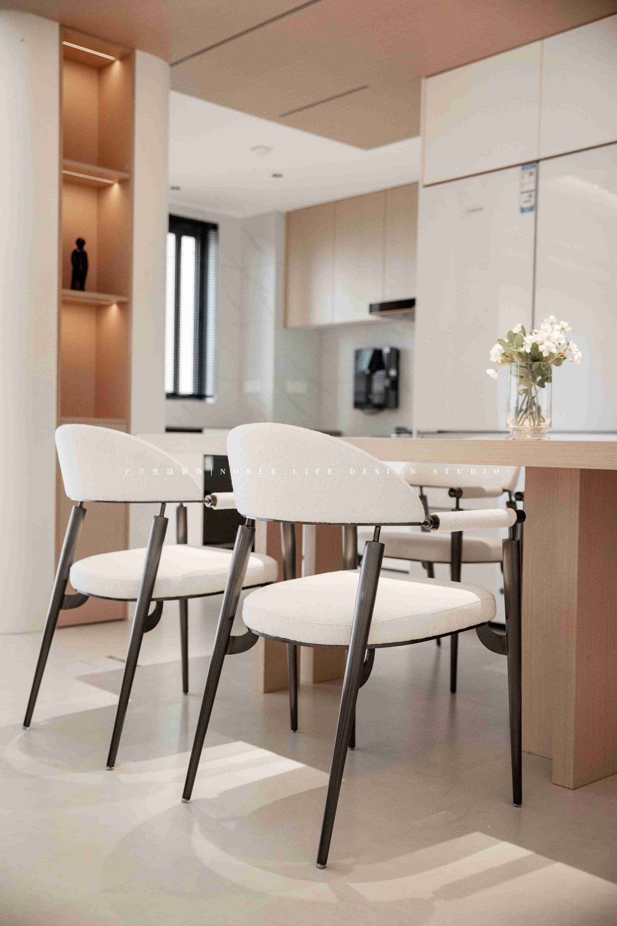 右側(cè)則是拆掉廚房的一面墻,擴大原本的廚房空間。重新規(guī)劃餐廚動線,打造一組60cm的深柜,既可做餐邊柜,又可做廚房補充柜。