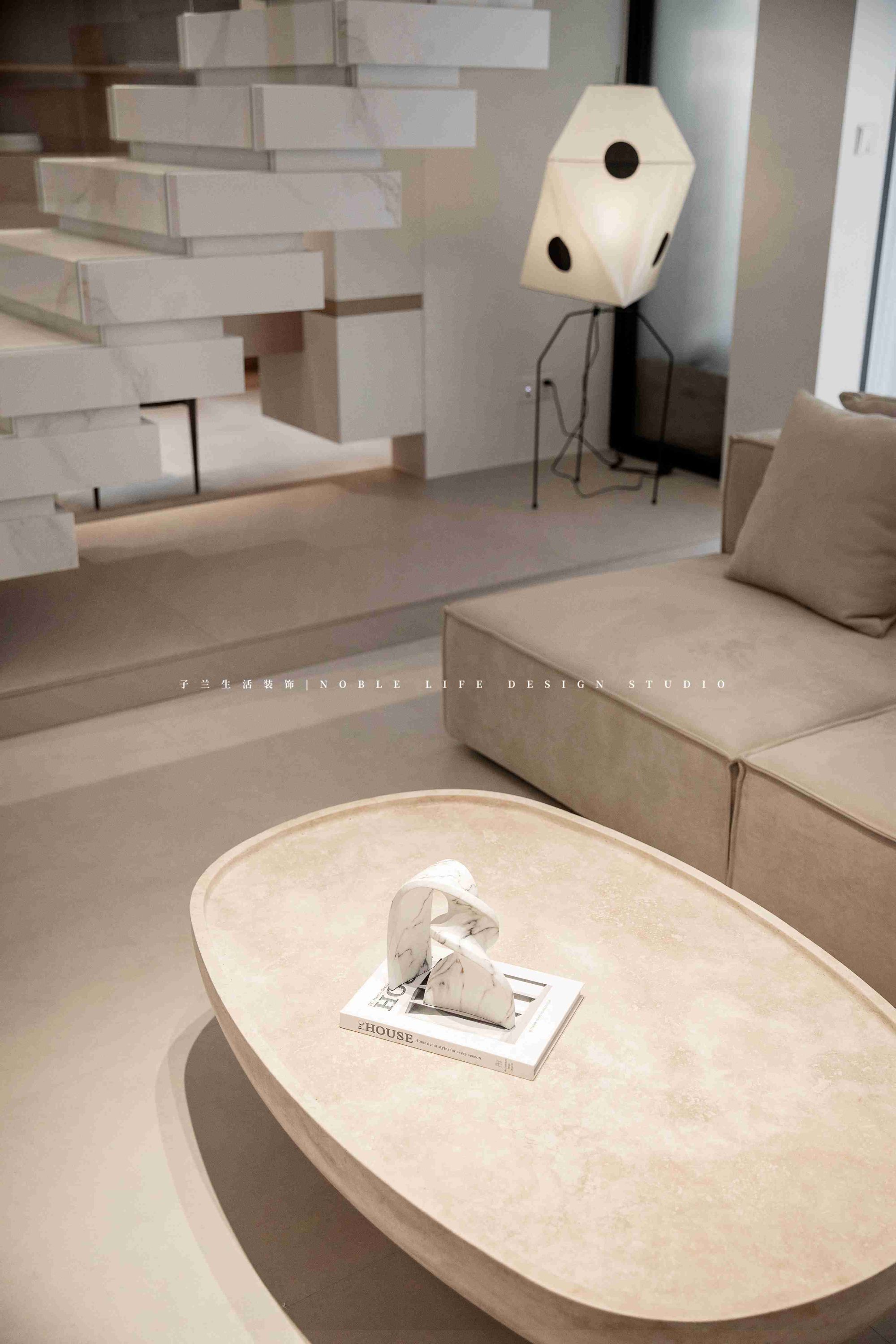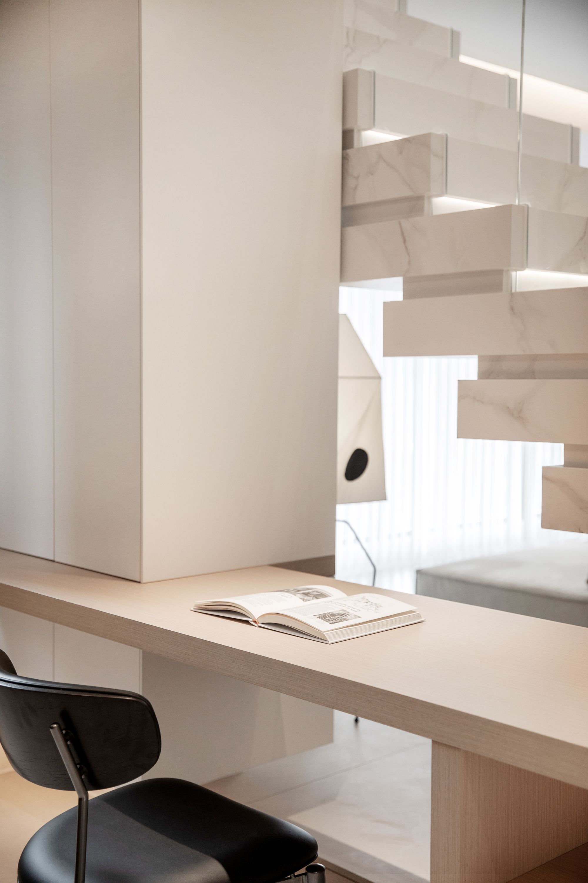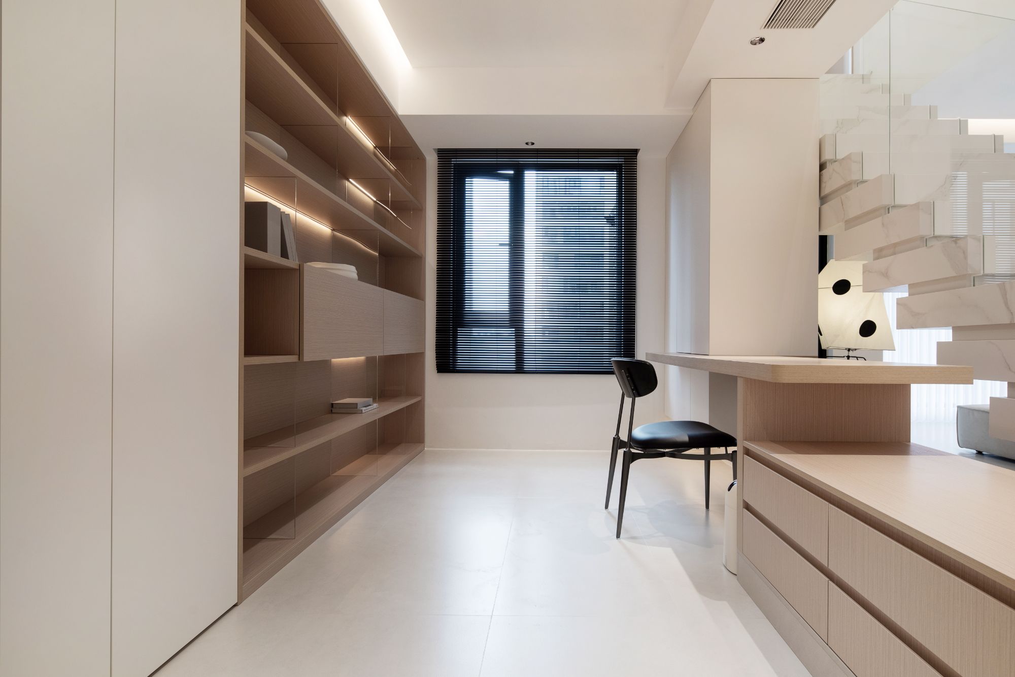 樓梯背后便是開放式書房,不能拆的承重墻做一個懸浮書桌,并在樓梯的延長階梯上打造一組矮柜,主打一個:不放過任何可以做收納的空間。靠墻打造整面書柜,一門到頂+開放格組合,可以放置館長先生和小藝小姐的書籍。