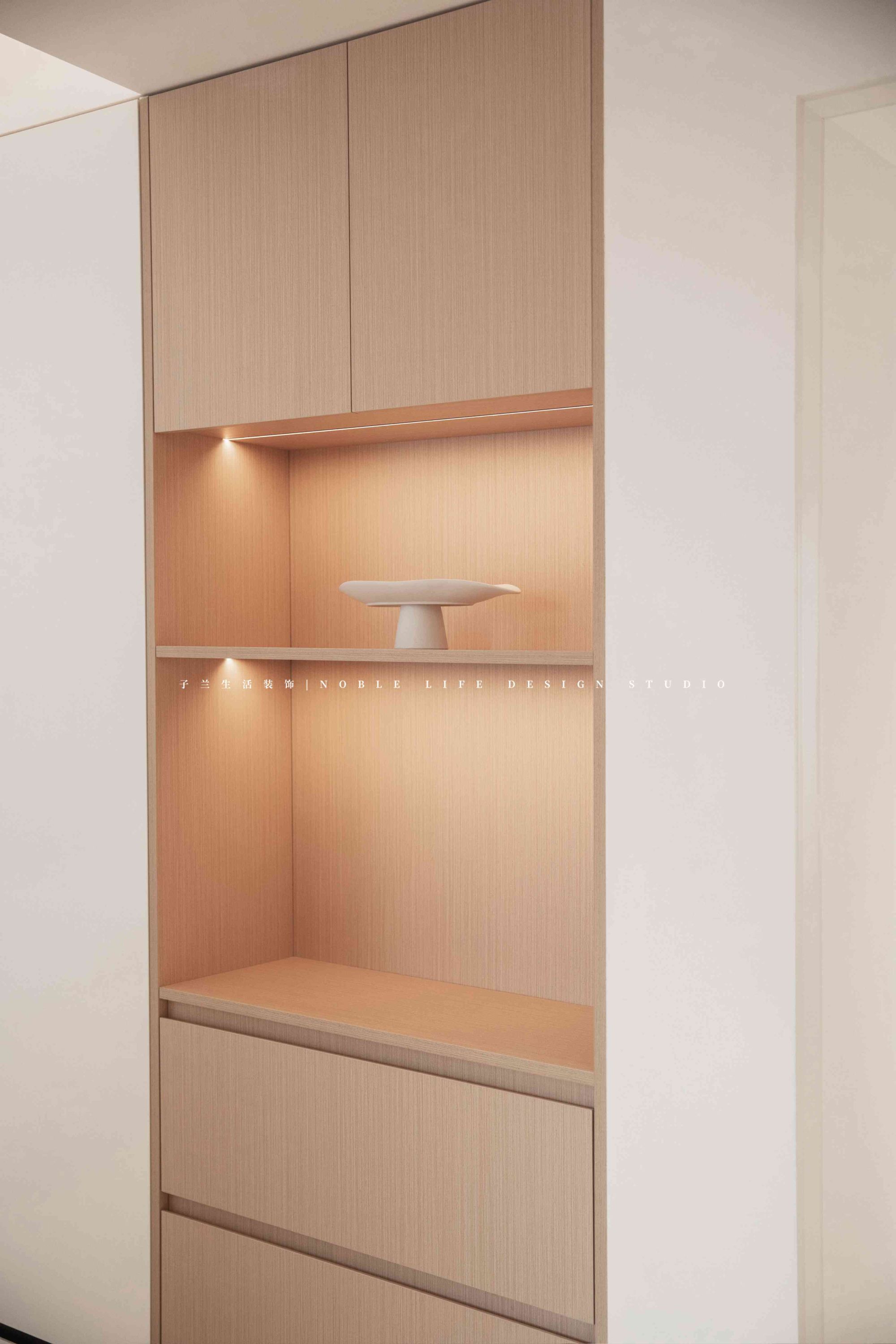 廚房與餐廳的轉(zhuǎn)角,上方做成壁龕擺放飾品,下方抽屜存放一些紙巾盤子等,背后再是一面的客廳雜物收納柜。