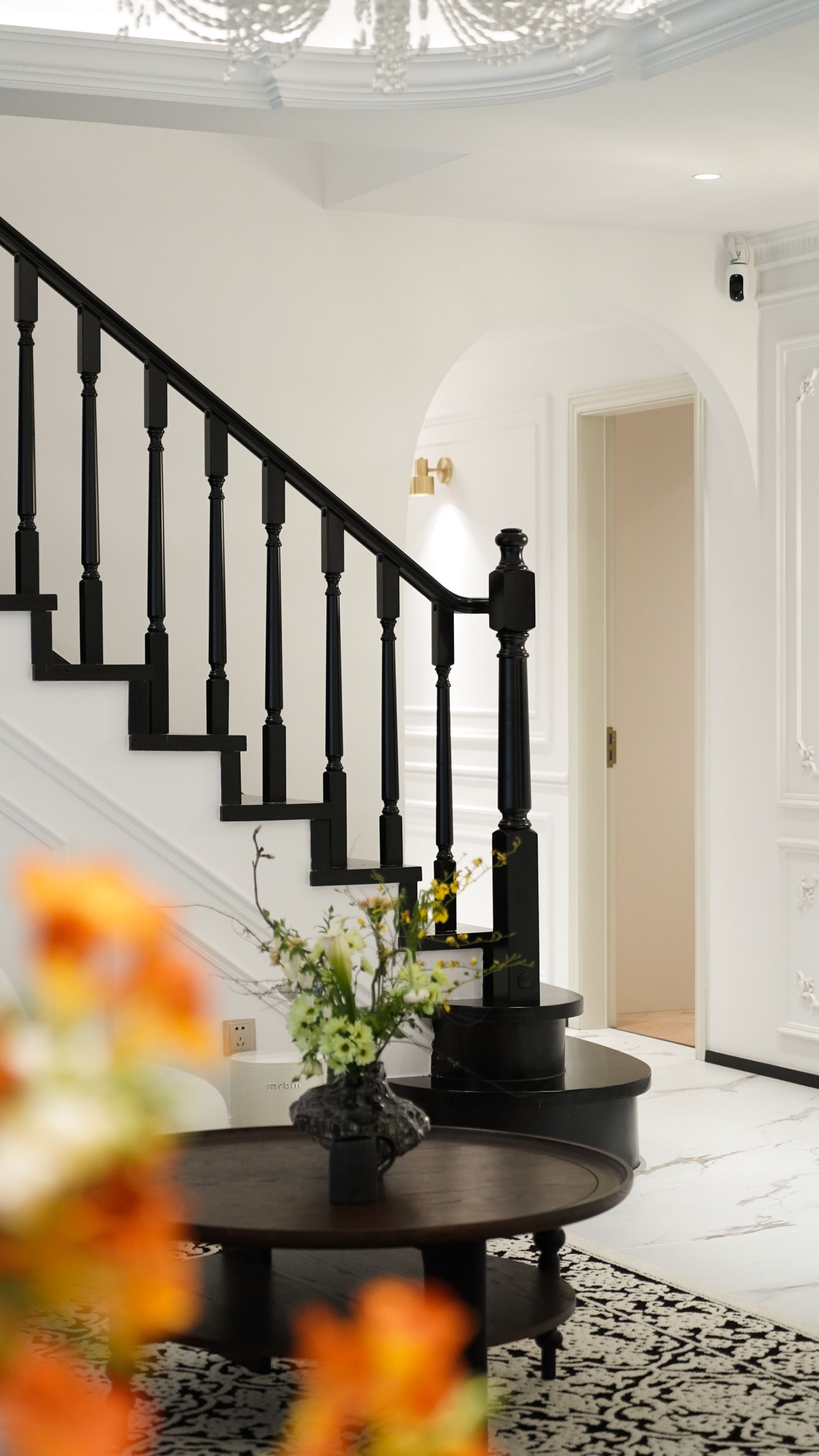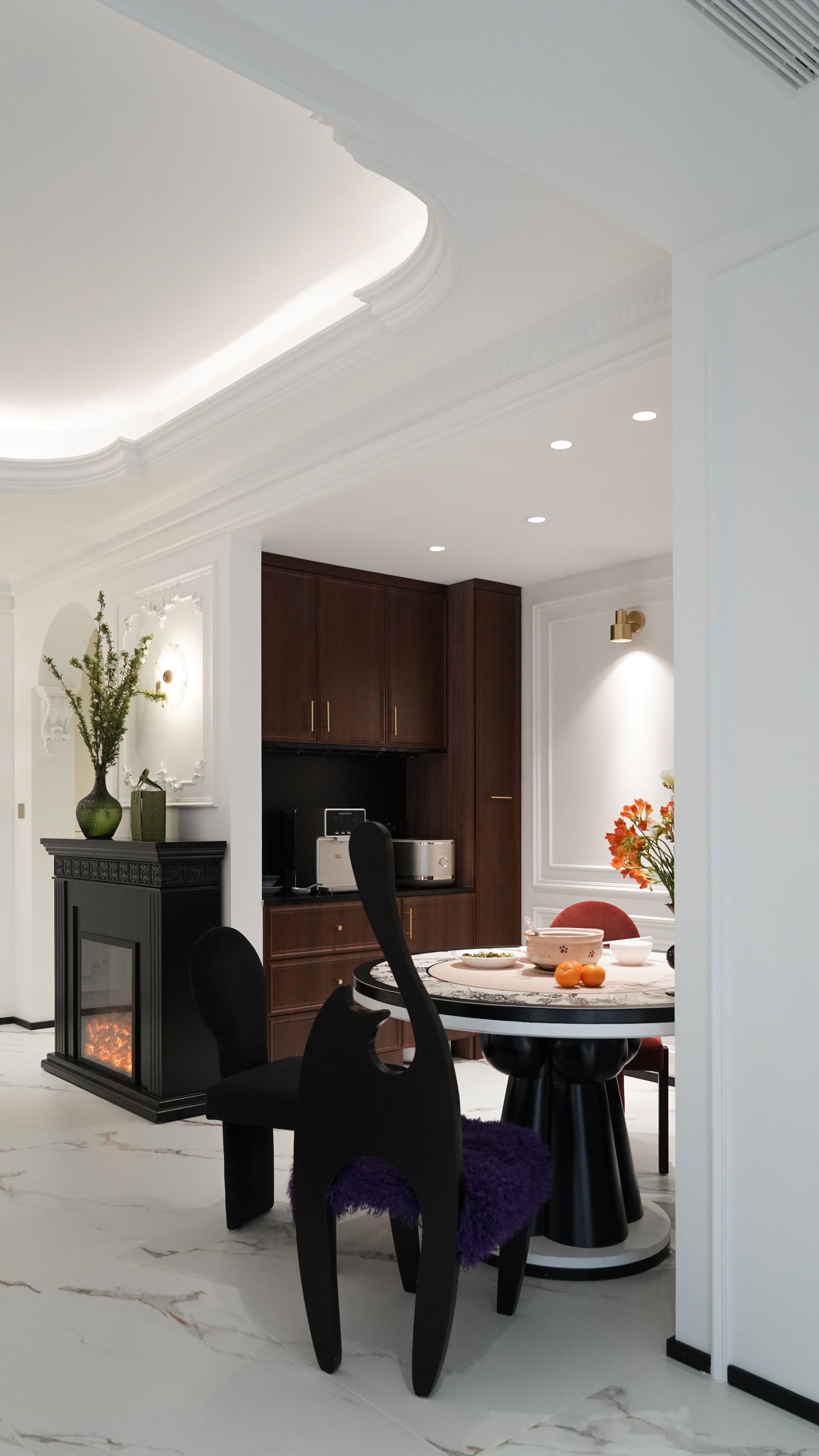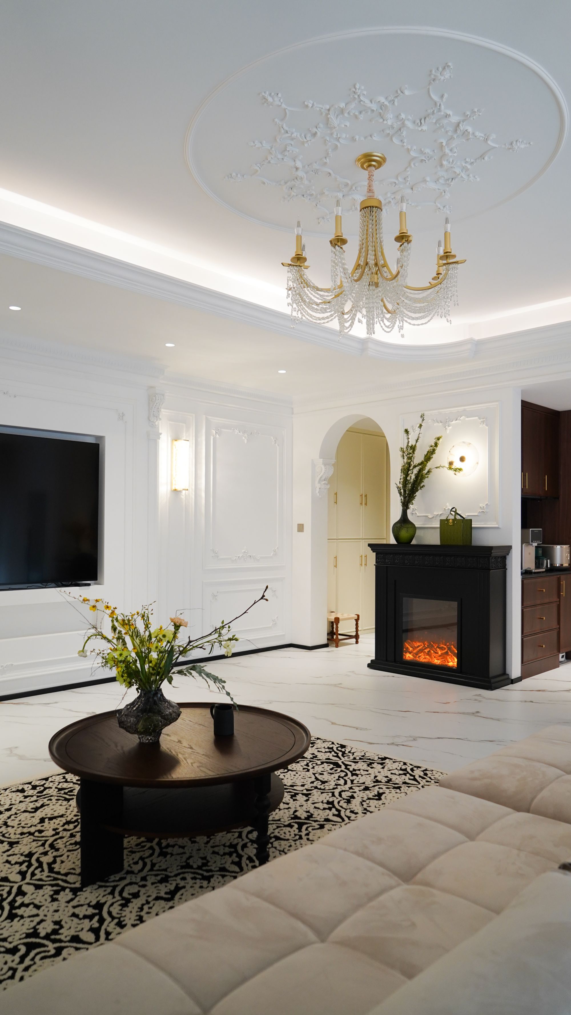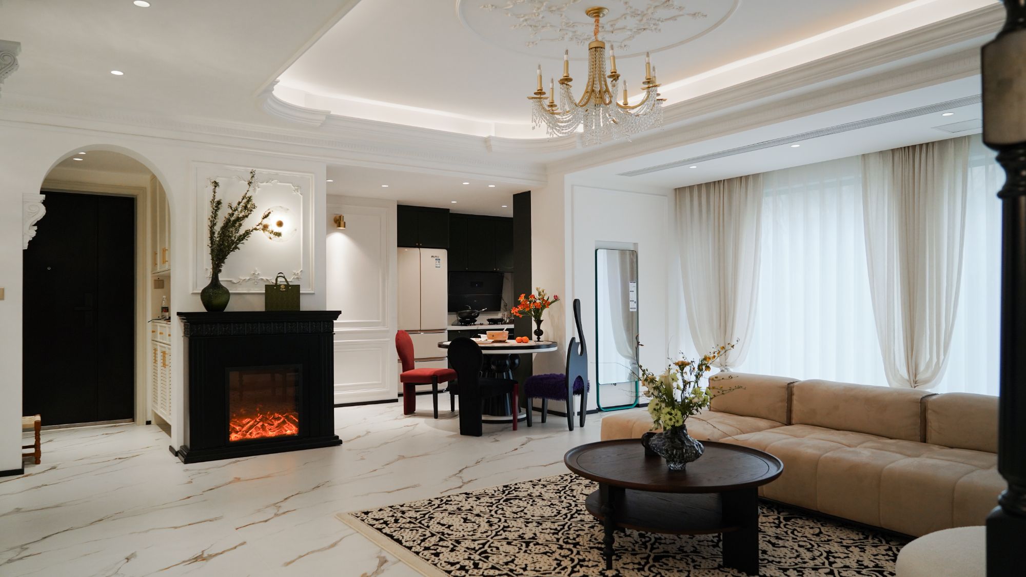月月的家是一套沒有人能拒絕的法式風(fēng)設(shè)計(jì),沒有壁爐怎么稱得上法式風(fēng)?推門進(jìn)屋,側(cè)靠墻安放壁爐,映入眼簾便是兩道拱形過道,賦予“回家”這個(gè)詞滿滿的儀式感。