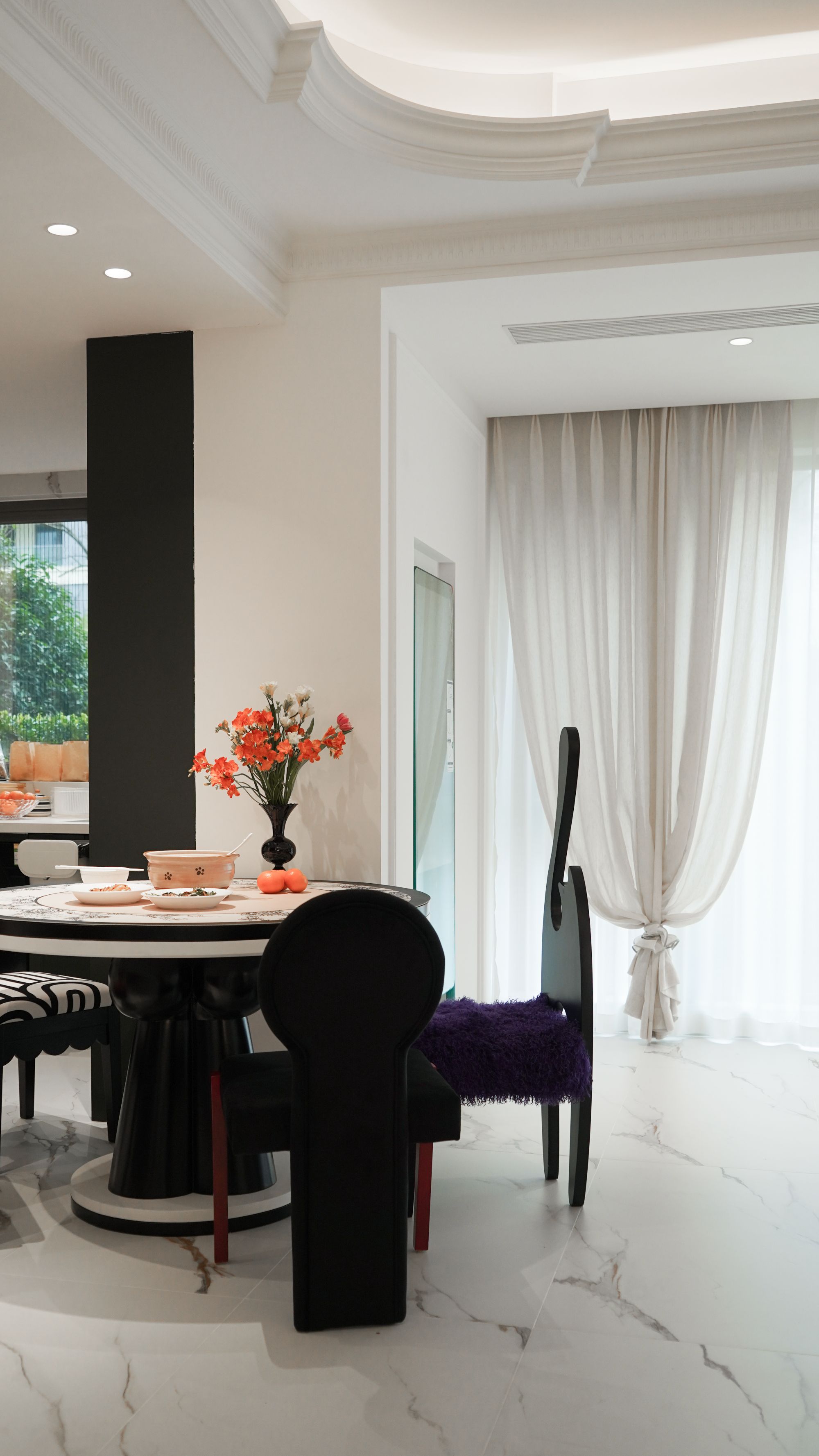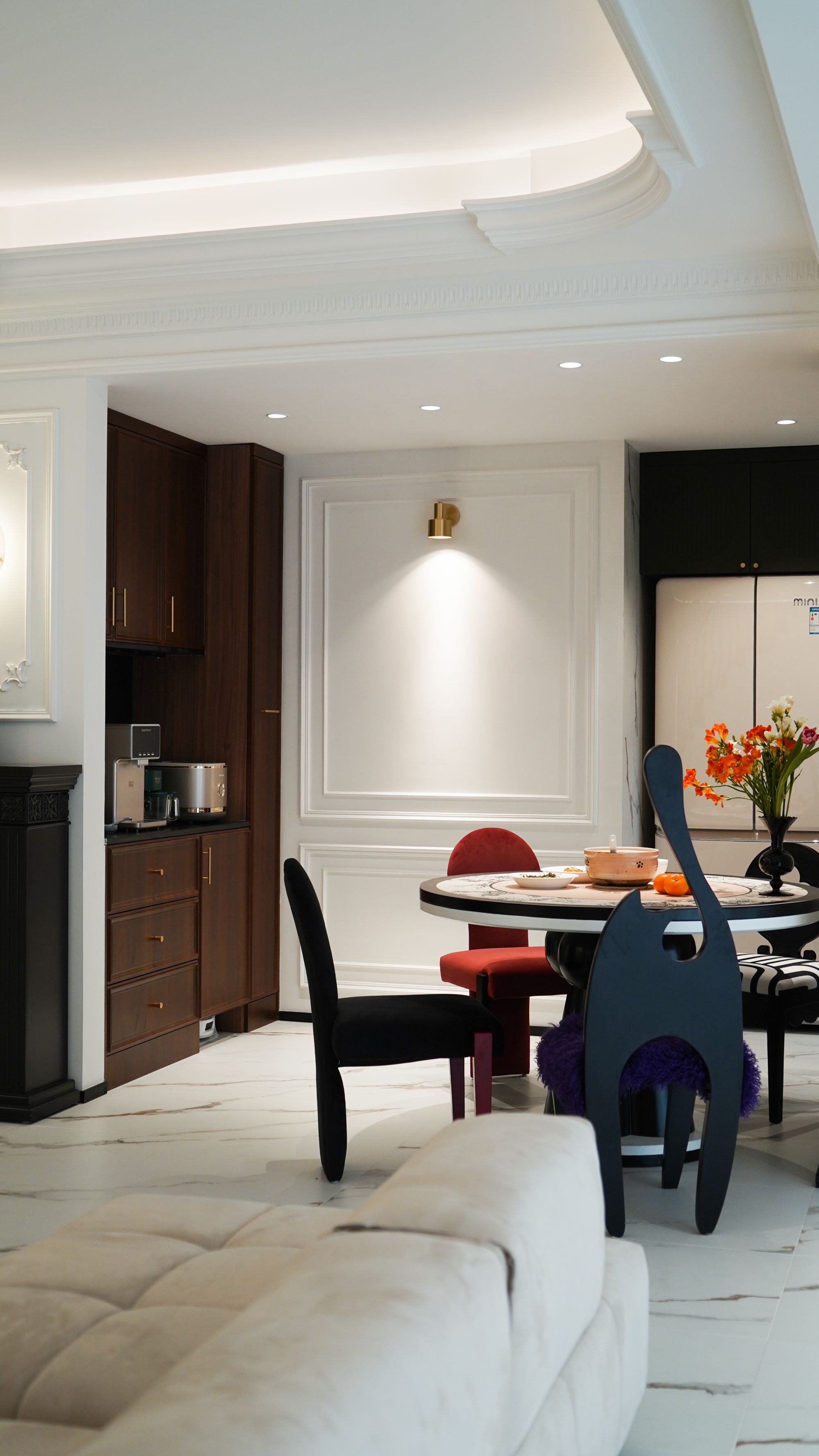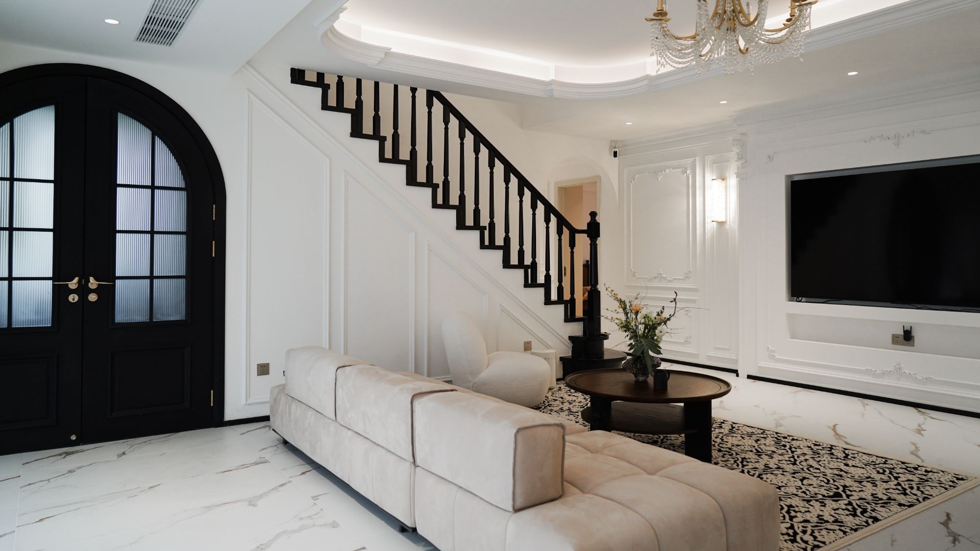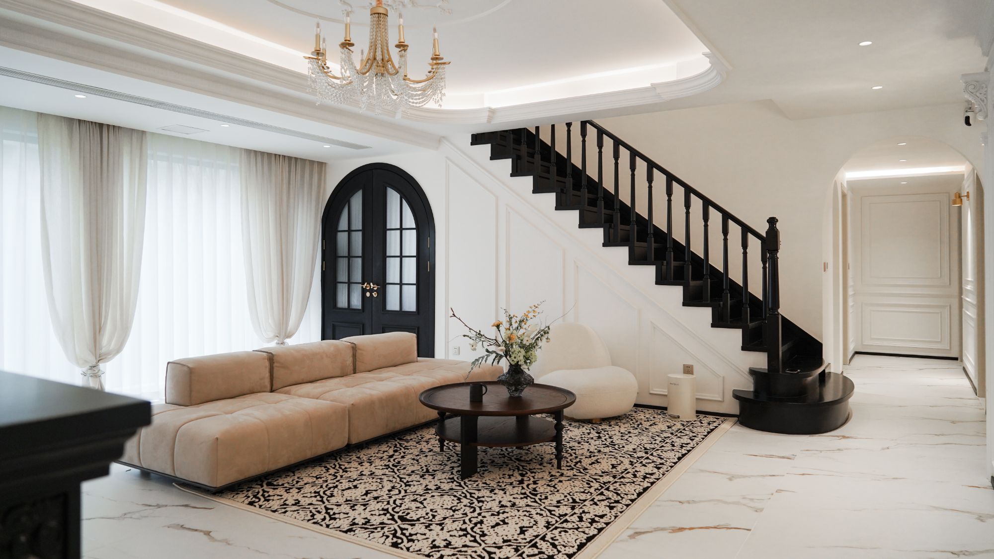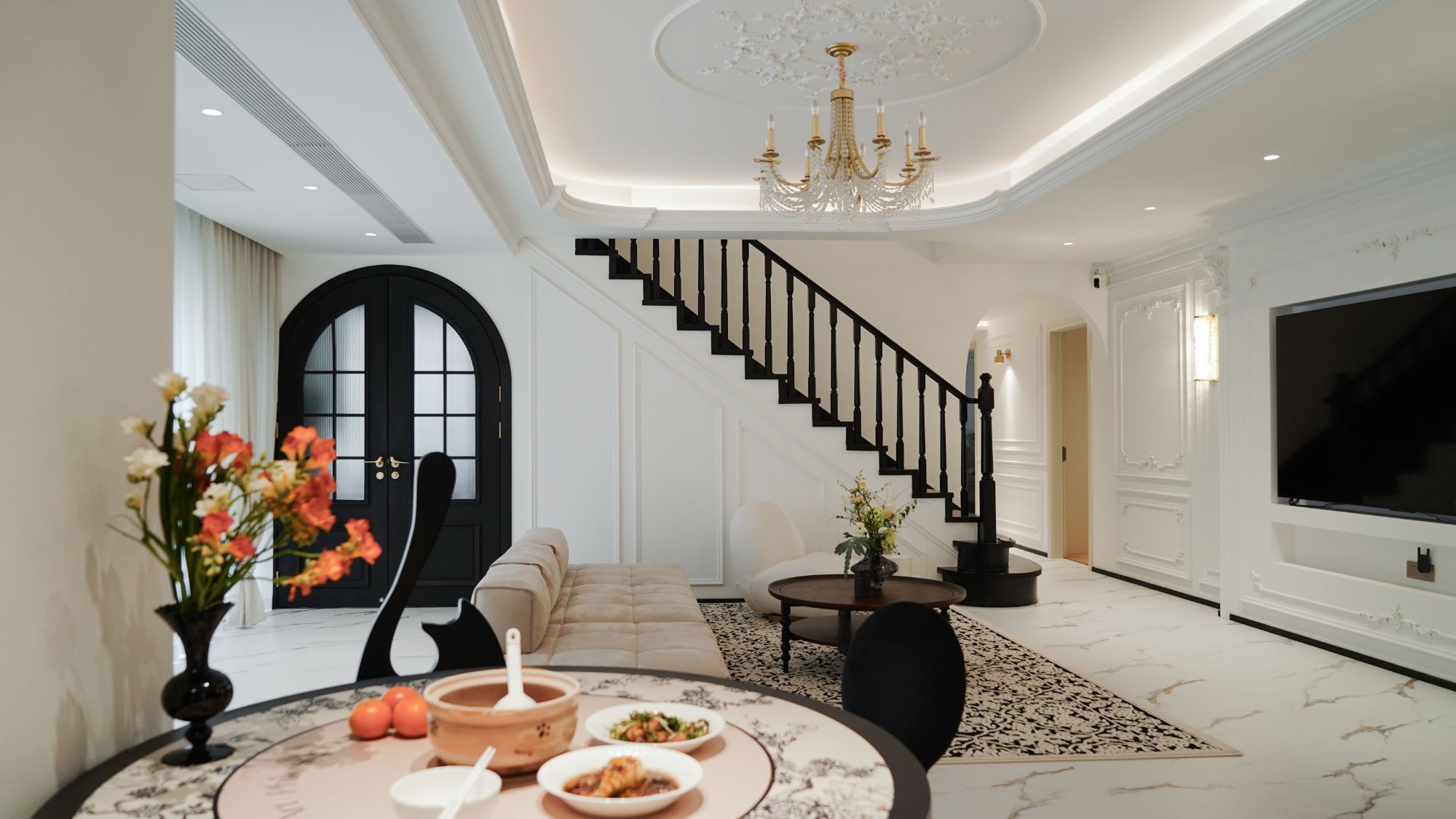 精致的雕花燈盤搭配繁復(fù)的吊頂,營(yíng)造出奢華而溫馨的法式氛圍,生活陽臺(tái)做黑色雙開門,真是儀式感拉滿!