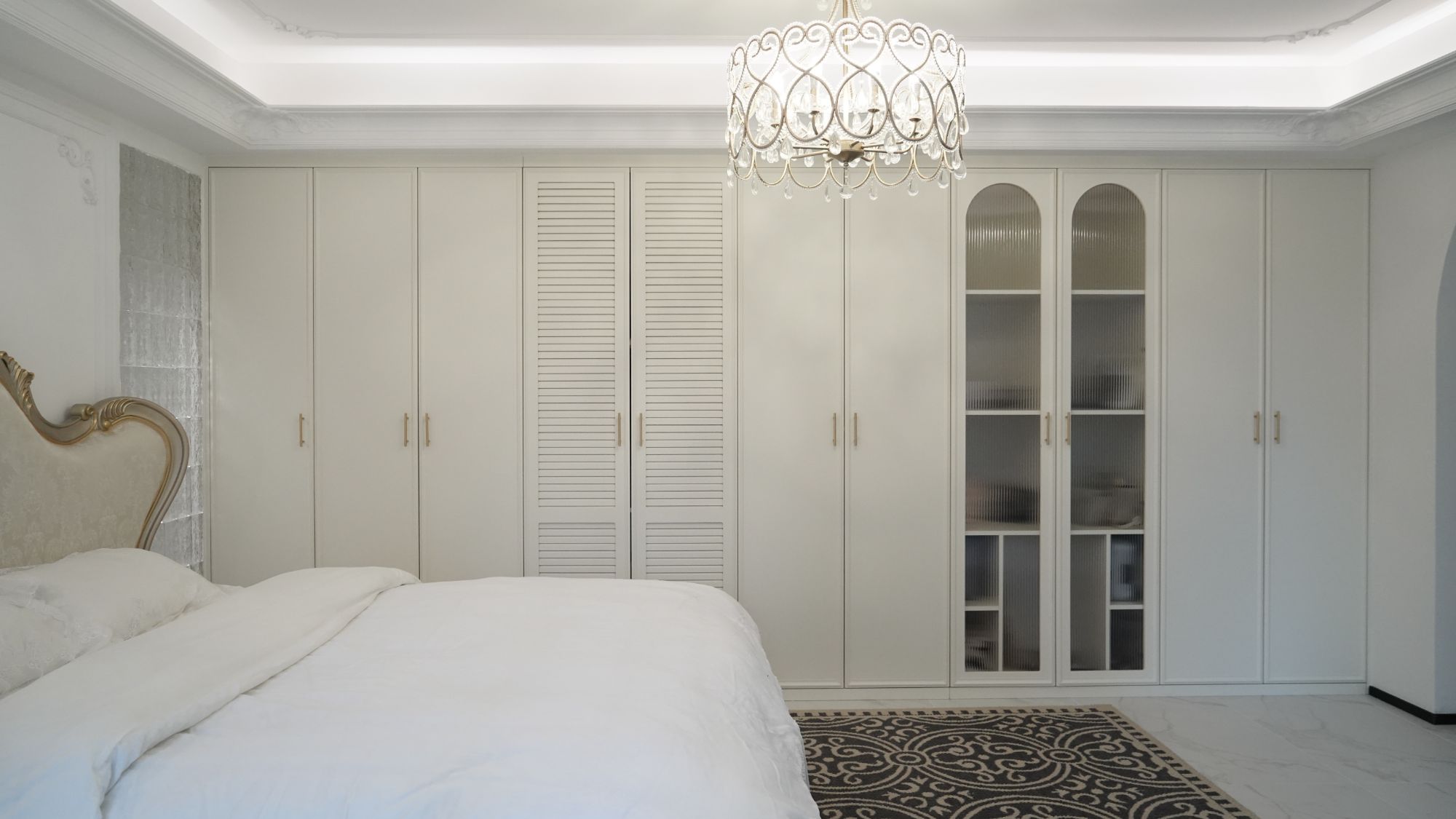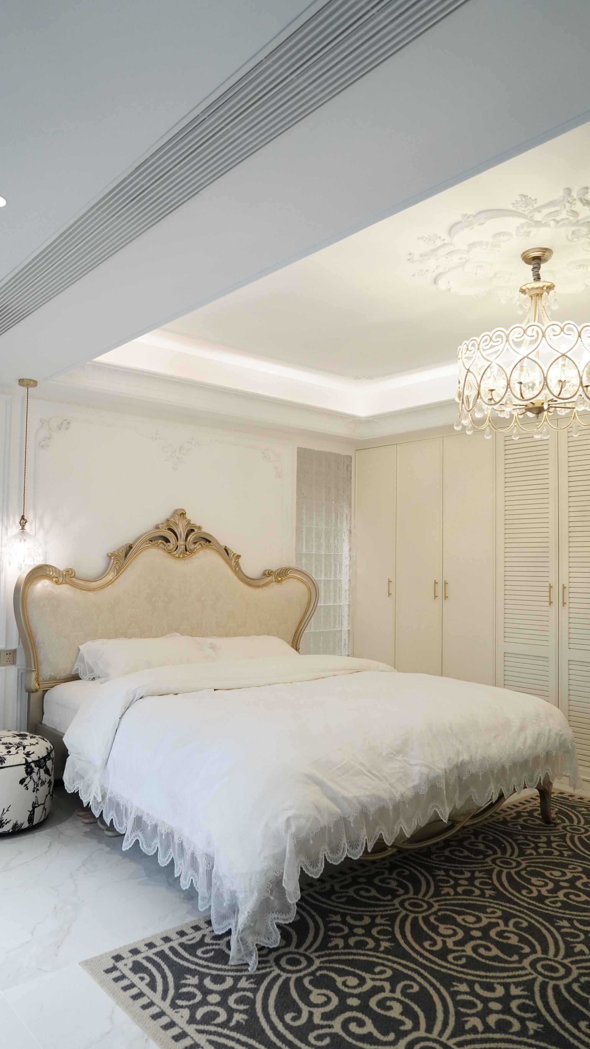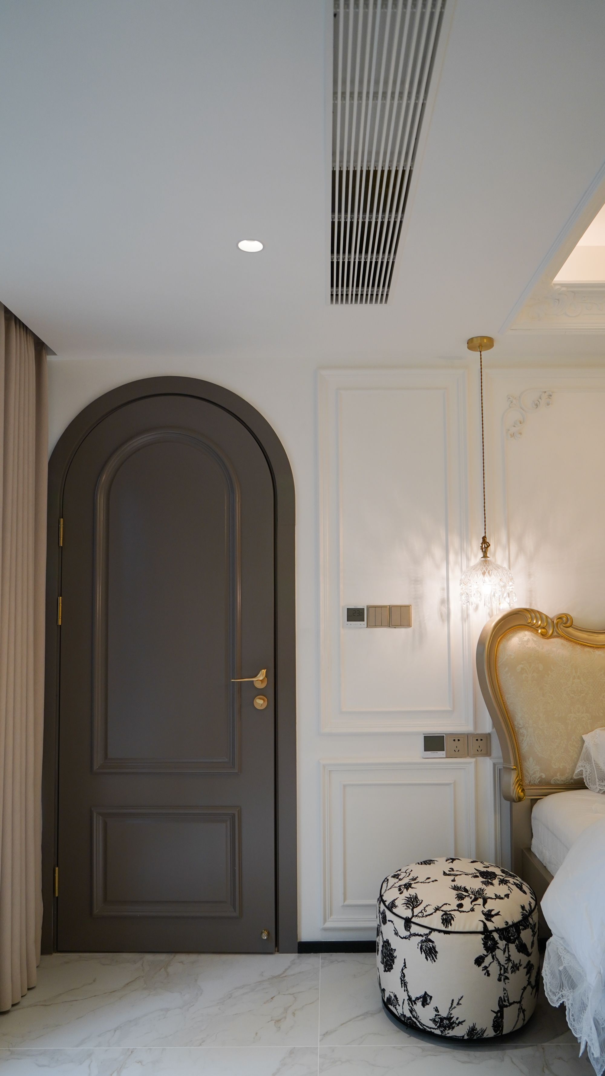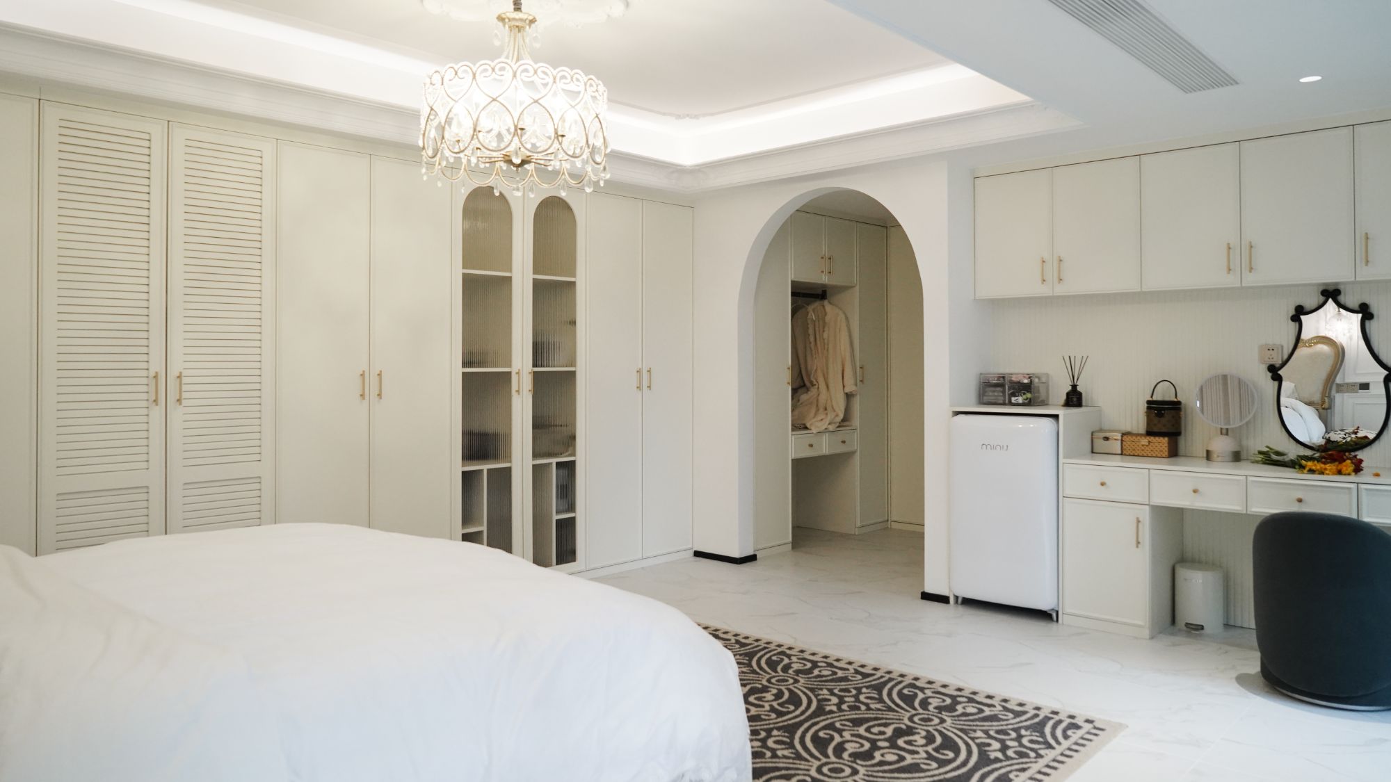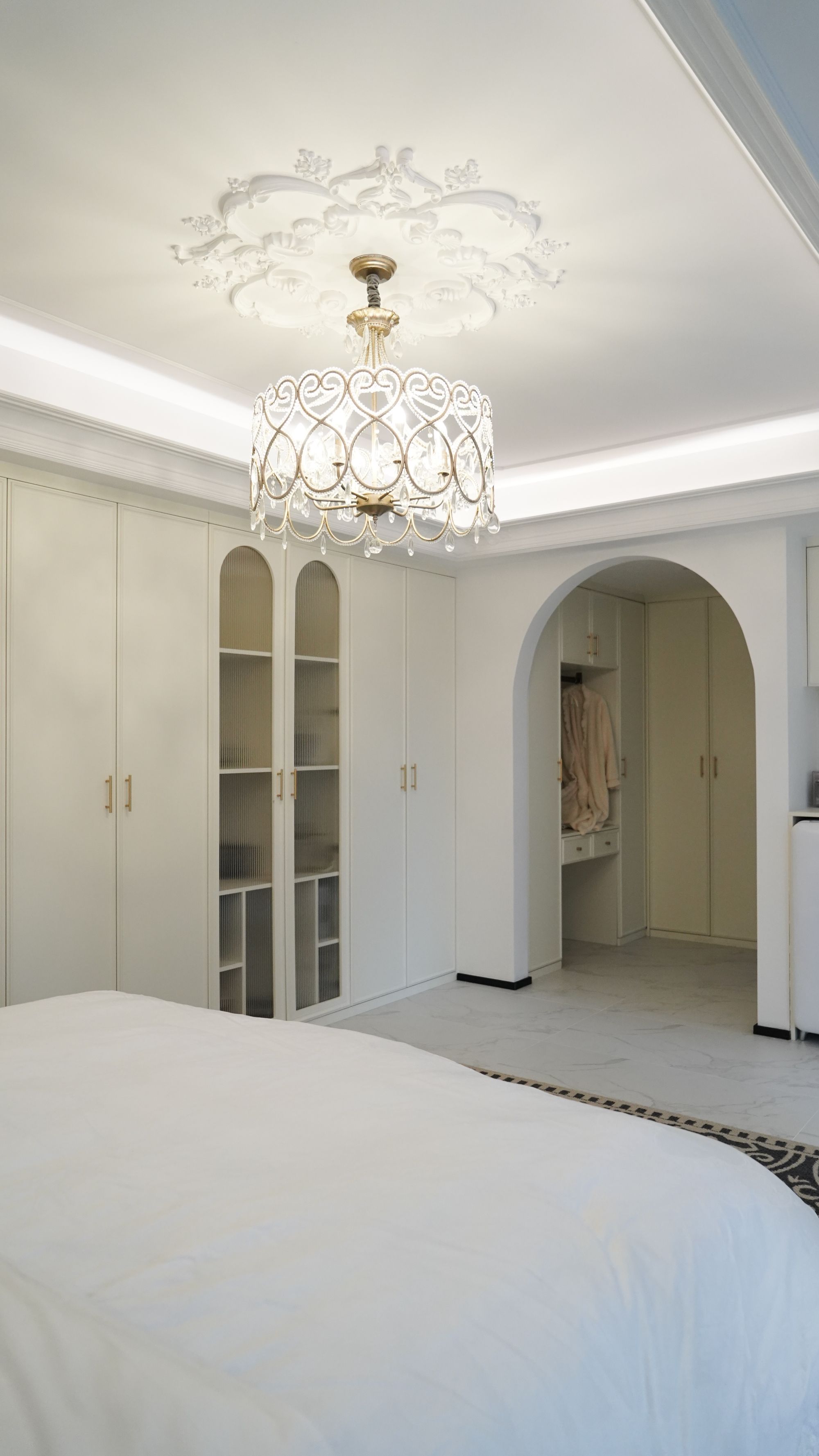 面對(duì)工作和生活的多重壓力,主臥套間就像是月月和她老公的一塊“自留地”,可以從忙碌的節(jié)奏中短暫抽離,享受難得的獨(dú)處時(shí)光。月月是忠誠(chéng)的白色愛好者,她的主臥便是純白色系的法式風(fēng)。雅致的法式線條、水晶吊燈以及凈衣區(qū)的拱門,把法式的氛圍感妥妥拿捏!