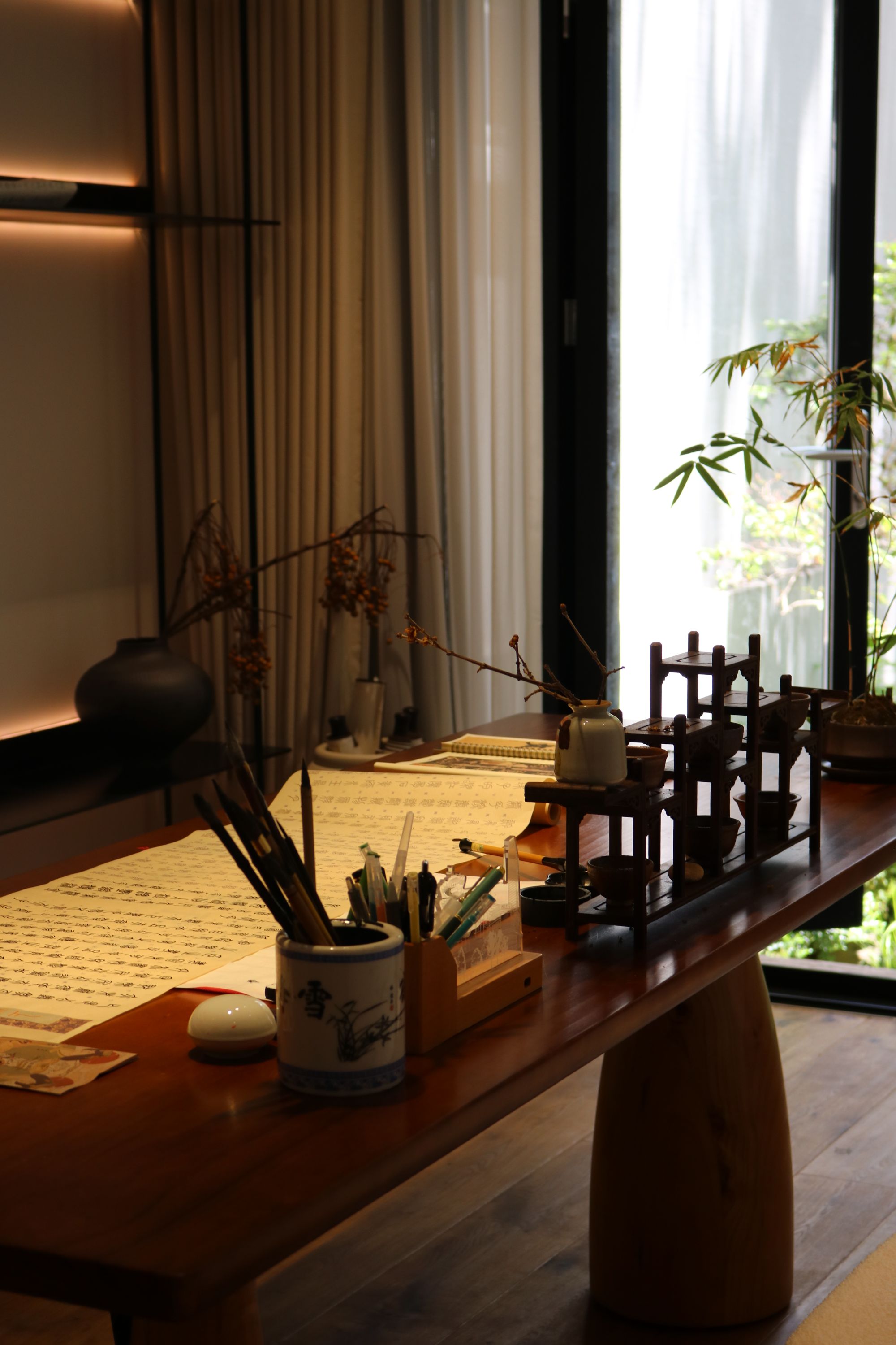 對山揖水、玩石焚香、品茗臨帖、約束插花,正是鄧姐與先生的日常生活。而這種回歸質(zhì)樸傳承傳統(tǒng)文化的生活方式也在影響著他們的兒女。 把書香融入生活,藝術(shù)成為生活的內(nèi)容。讓一塊石頭、一株山草、一支野花都在這個家有了自己獨(dú)特的展示方式。